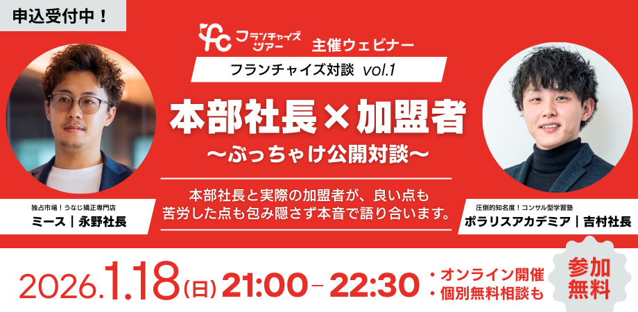 お知らせフランチャイズってぶっちゃけどうなの? そんな疑問に対して、 本部社長だけでなく加盟者にご登壇いただき赤裸々に語っていただきます! 資料や表には出てこない 「生の判断」「生の感情」「生の数字感」が聞けるのはこのウェビナーだけ。 ぜひご参加ください! ■ セミナー内容 ・フランチャイズってどんな仕組み?基礎を学ぶ ・第1部:うなじ矯正専門店ミース|永野社長ご登壇 ①ビジネスモデルのご紹介 ②永野社長×加盟者対談 ・第2部:コンサル型学習塾ポラリスアカデミア|吉村社長ご登壇 ①ビジネスモデルのご紹介 ②吉村社長×加盟者対談 ・運営によるフランチャイズ無料相談会 ■ 開催概要 ・開催日時:2026/1/18(日)21:00〜22:30 ・開催場所:オンライン(Zoom ウェビナー) ※URLはお申込後にお伝え致します。 ・参加費用:無料 ▶ ご参加は、[お問い合わせフォーム]よりお気軽にどうぞ。 [contact-form-7 id="62206a2" title="コンタクトフォーム 1"] 続きを読む